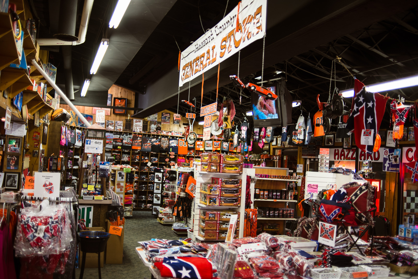 Here, you can buy basically anything you might imagine would be associated with Dukes of Hazzard: T-shirts, toys, pictures, props, a Confederate flag spare tire cover, Hazzard County license plates, and so on. You can get your photo sitting in the General Lee. They even have mini-golf and go-karts, for some reason.